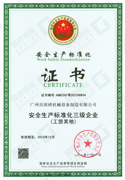 2012年12月24日,國家安全生產監督管理總局為國研機械公司頒發了《安全生產標準化企業證書》,這意味著我司已達到《廣州市工業企業安全生產標準化評定辦法》及《廣州市工業企業安全生產標準化評定標準》的要求。