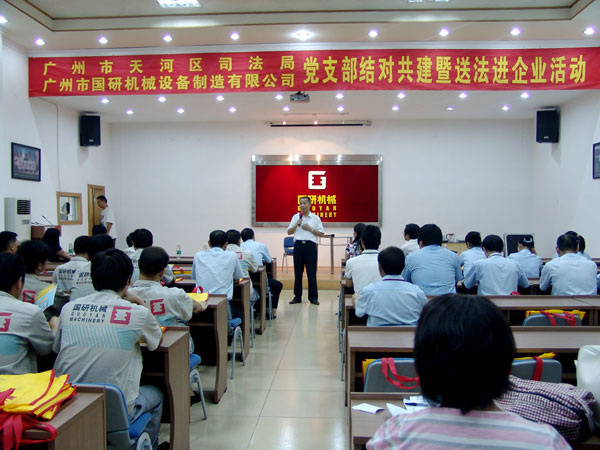 9月7日下午,廣州市天河區(qū)司法局黨支部和文教工作隊(duì)一行18人在局長(zhǎng)羅育輝和副局長(zhǎng)曾曉云的帶領(lǐng)下,來(lái)到廣州市國(guó)研機(jī)械設(shè)備制造有限公司舉行黨支部結(jié)對(duì)共建暨送法進(jìn)企業(yè)活動(dòng)。