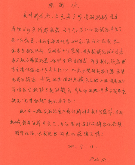 5月13日下午,一封署名為鄧名兵的感謝信送至公司領導手中,信中詳細描述了公司倉管員歐小鳳拾金不昧的感人事跡,請求公司對歐小鳳進行表揚,并感謝公司培養了歐小鳳這樣的好員工。