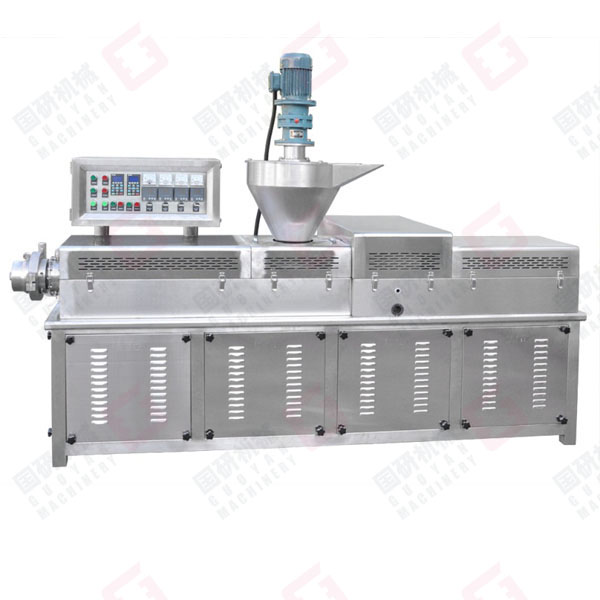 原料(面粉)→加水斷續攪拌→物料輸送→強制喂料→高溫半膨化擠出→面片冷卻輸送→切條切斷→包裝