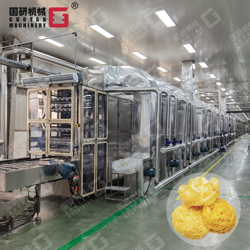 高溫半膨化非油炸方便面生產(chǎn)線,是集自動和面、自動加料、擠壓膨化、面片冷卻輸送、自動切條、分行輸送自動提升、加濕回軟切斷、自動落盒成形、自動干燥到成品輸送入包裝于一體的全自動生產(chǎn)線。該設備主要應用于擠出式非油炸快食面的生產(chǎn),工藝流暢、功能齊全、自動化程度高,機器出品穩(wěn)定,工藝技術強于國內(nèi)同類生產(chǎn)設備,是油炸方便面廠家更新?lián)Q代的理想選擇。